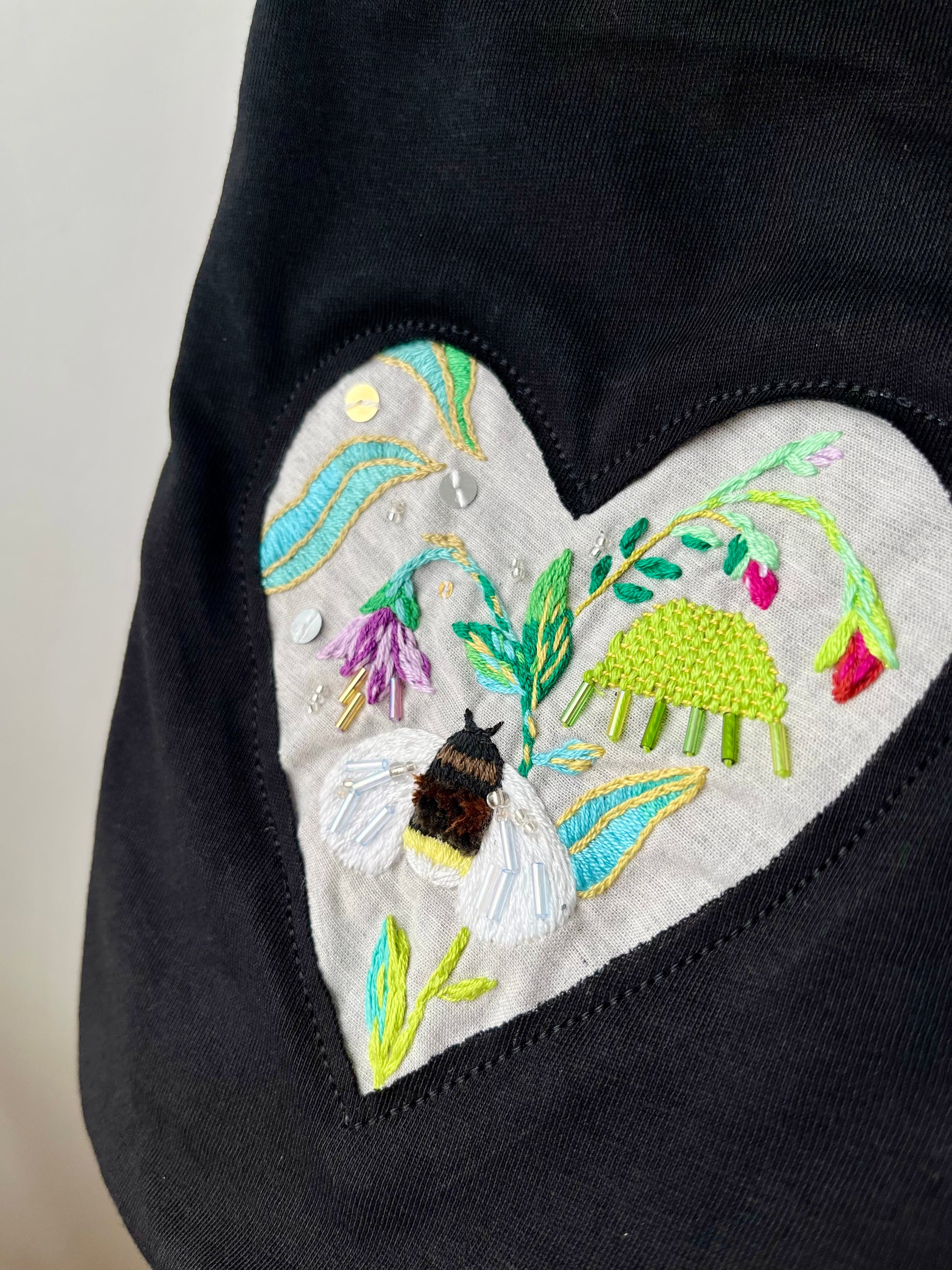 Handbesticktes T-Shirt – Gartenherz mit Hummel (Schwarz, XL)