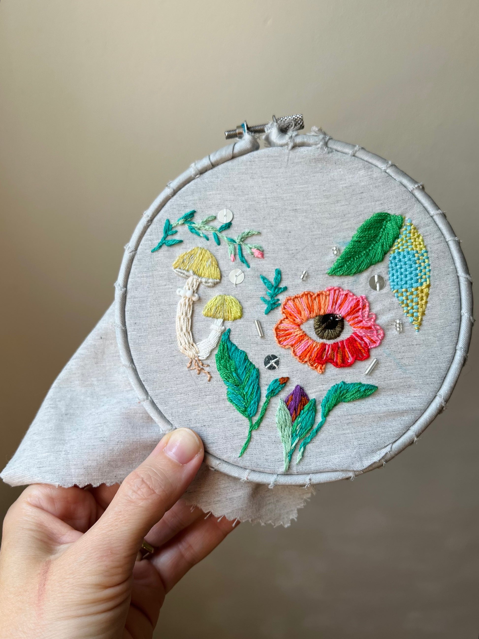 The design showcases a striking embroidered flower with an eye at its center in coral and pink tones, accompanied by mushrooms, richly detailed green leaves, and decorative stitching patterns that bring the entire garden scene to life.