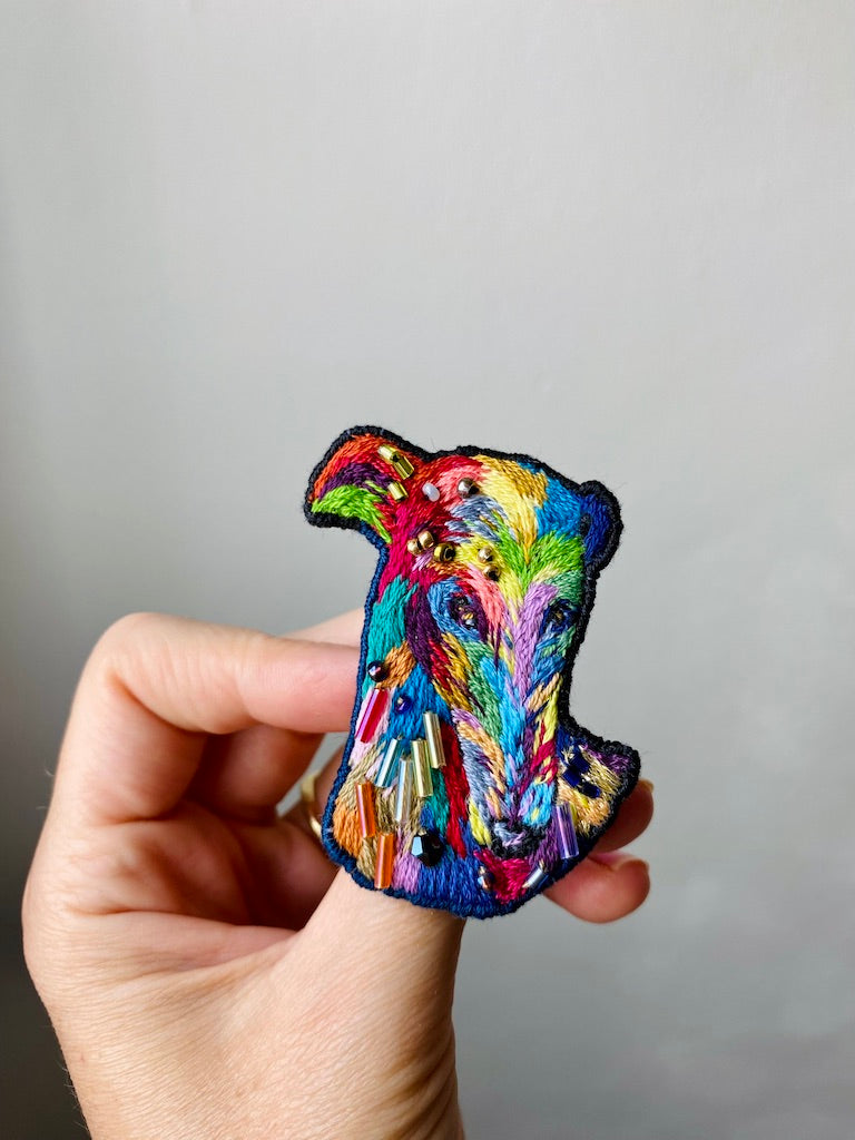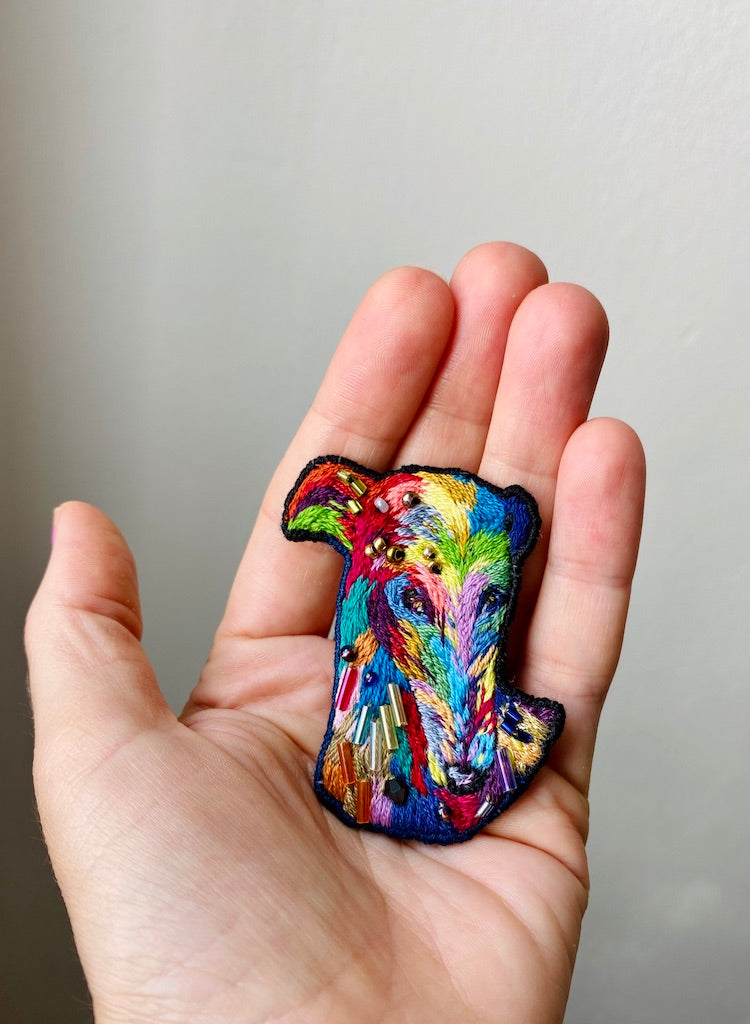 Handmade Embroidered Brooch – Rainbow Greyhound
