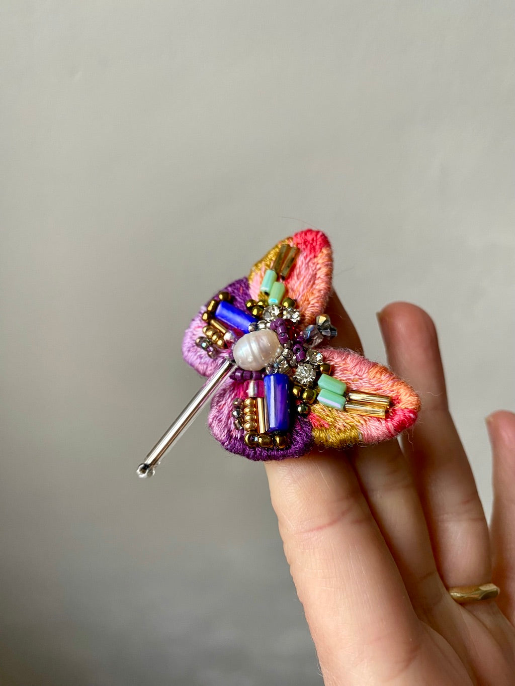 Each butterfly brooch is lovingly made by hand in a small studio in Vienna, where meticulous embroidery craftsmanship meets playful design.