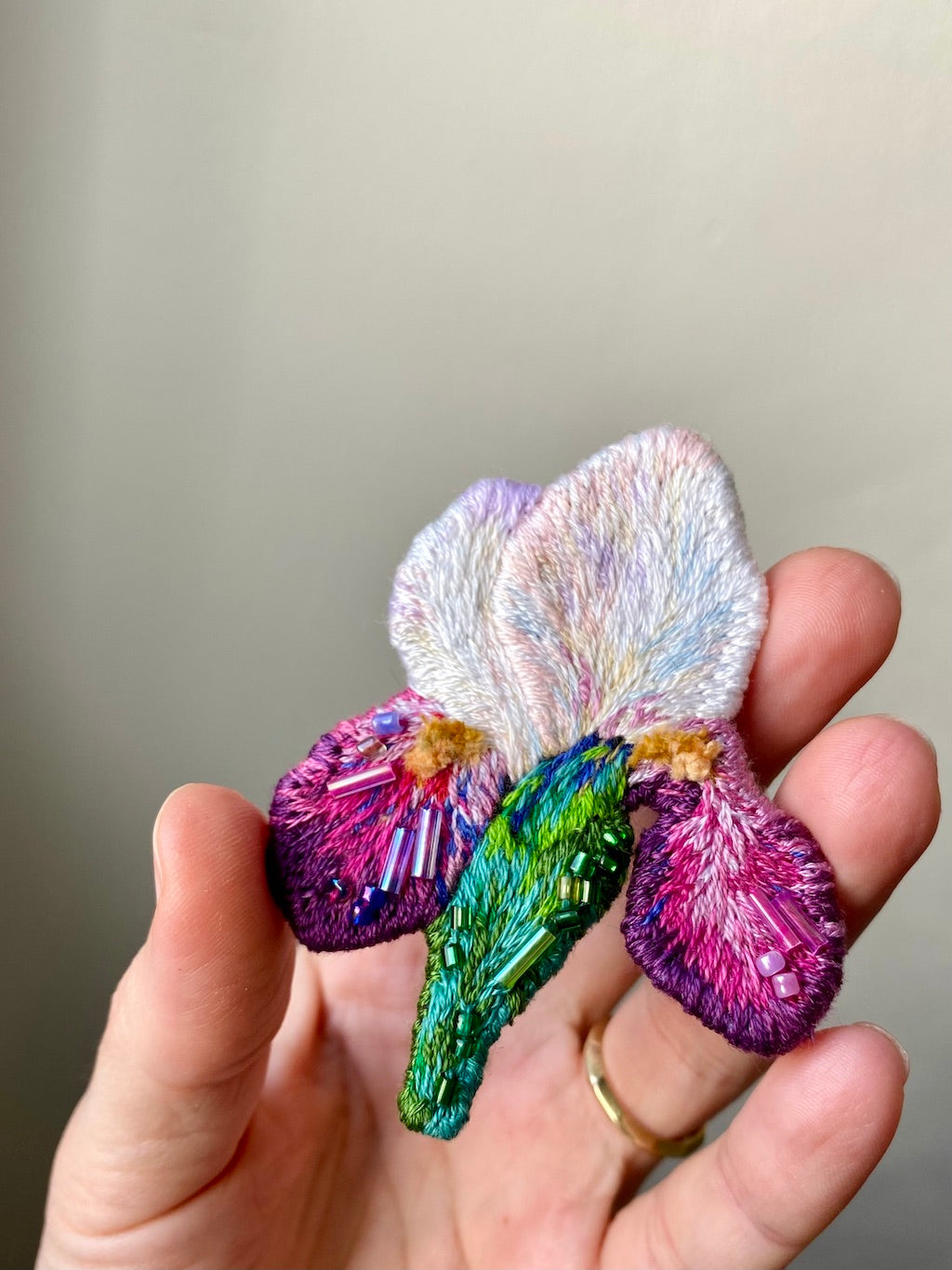 An elegant hand-embroidered white iris brooch that captures the delicate beauty of this classic flower. Adorned with fine glass beads that add subtle sparkle, this sophisticated accessory brings a touch of botanical elegance to any outfit.