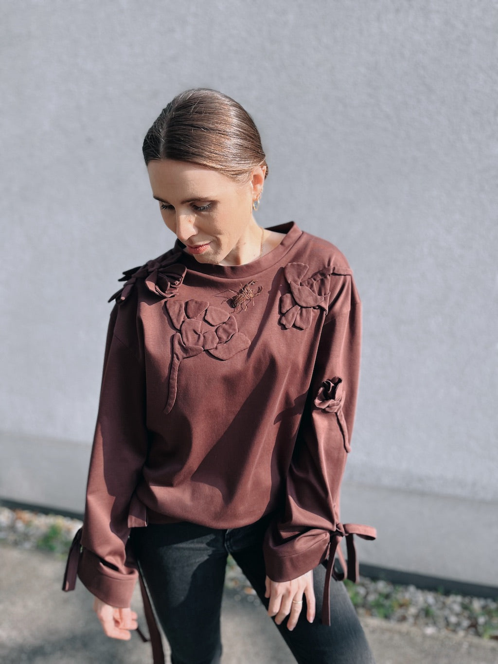 Soft, organic cotton sweater in a relaxed fit with hand-stitched flowers creating a unique 3D texture. Made from 100% GOTS® certified mercerized interlock cotton in a rich chocolate brown color.