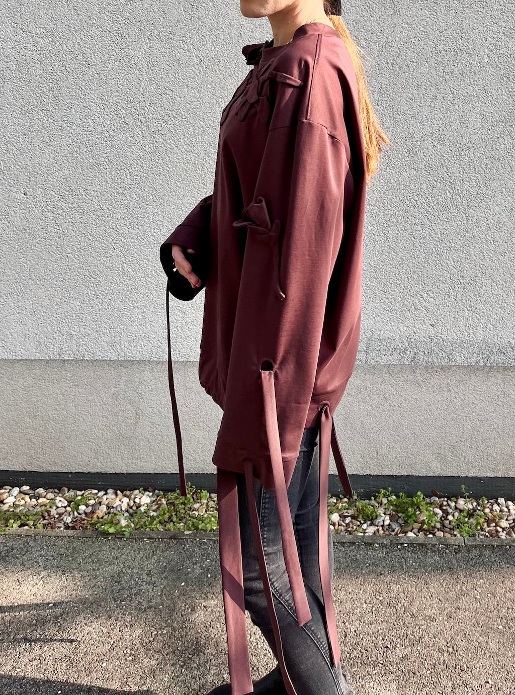 Relaxed fit with adjustable features. Front length 62 cm, chest width 62.5 cm, sleeve length 62 cm (measured 15 cm from collar). Ribbons allow you to adjust sleeve and sweater length for various styling options. Model is 160 cm tall. Need customization? Contact me via the contact form.