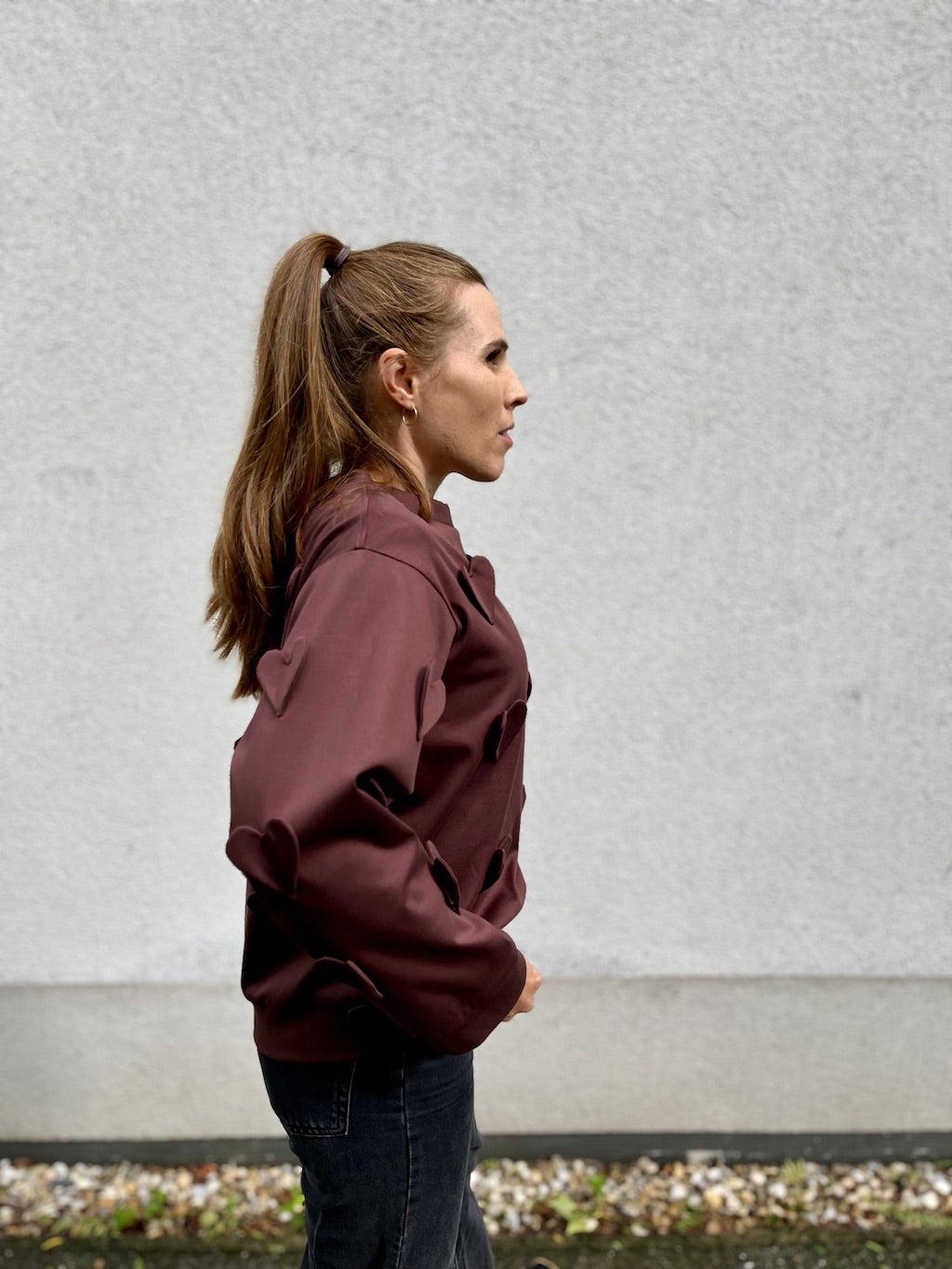Soft, organic cotton sweater in a relaxed fit with hand-stitched hearts creating a unique 3D texture. Made from 100% GOTS® certified mercerized interlock cotton in a rich chocolate brown color.